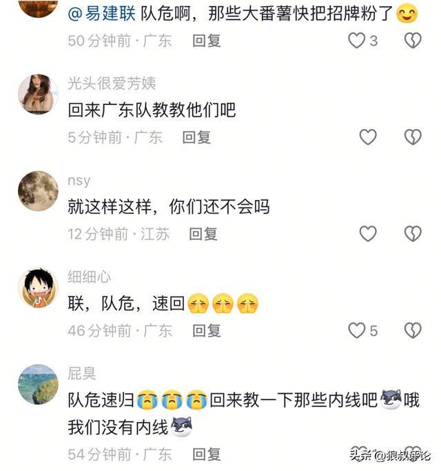 球迷对于阿联这个教学的动态,评论方面也几乎出现一边倒,希望阿联回去广东男篮,好好给这一群“大番薯”上一课,尤其是一部分有潜力的年轻球员,需要他去讲解内线脚步,卡位等细节。